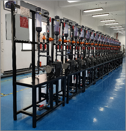 配色是印染廠、紡織廠生產(chǎn)過程中的重要環(huán)節(jié),為了保持配色結(jié)果的準(zhǔn)確性,就可以應(yīng)用電腦配色系統(tǒng)。奧泰克為該項(xiàng)目提供了35臺(tái)E01系列的超精度電微分泵,其輸出特點(diǎn)為大區(qū)間高精度輸出控制,輸送區(qū)間為1~1000ml/min,輸出各類色彩牌號(hào)的色劑,由于需要連續(xù)穩(wěn)定切無脈動(dòng)現(xiàn)象的輸出效果,因此采用E01M2型機(jī)架,內(nèi)部集成阻尼器,背壓閥和各種管閥總成,18臺(tái)機(jī)架和35臺(tái)E01系列電微分泵組成了整個(gè)染色車間的自動(dòng)化配色系統(tǒng)。