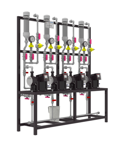 銅箔是新能源電池行業的關鍵零件,本項目為海寧海逸為浙江最大的銅箔制造廠的制造工藝中精確添加硫酸銅溶液項目,添加液為硫酸銅溶液,流量區間為1-700ml/min,輸出揚程約60m,輸出添加工藝點42個,由于需要連續穩定切無脈動現象的輸出效果,因此采用M4型機架,內部集成阻尼器,背壓閥和各種管閥總成,11個E01M4機架和42臺E01電微分泵組成了本自動化藥劑系統。